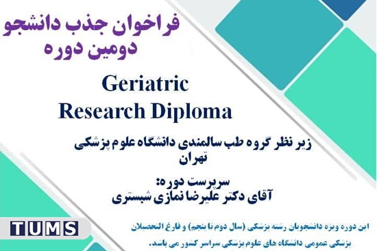 به گزارش روابط عمومی دانشگاه علوم پزشکی تهران مرکز رشد استعدادهای درخشان، مرکز پژوهش های علمی دانشجویان و مرکز تحقیقات سلامت سالمندی دانشگاه علوم پزشکی تهران، پس از برگزاری موفقیت آمیز اولین دوره دیپلم پژوهشی سالمندی تحت نظارت جناب آقای دکتر علیرضا نمازی (عضو هیئت علمی گروه طب سالمندی دانشگاه علوم پزشکی تهران) با هدف تولید علم و تربیت نیروی انسانی کارآمد در چالش روند رو به رشد جمعیت سالمندی کشور ایران، دومین دوره دیپلم پژوهشی سالمندی را برگزار میکند.