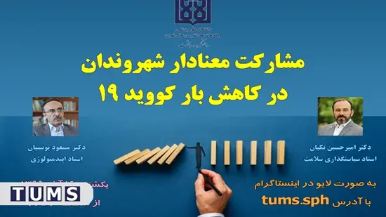 به گزارش روابط عمومی دانشگاه علوم پزشکی تهران دانشکده بهداشت، ششمین نشست علمی هفتگی (لایو اینستاگرام) در دانشکده بهداشت با موضوع مشارکت معنادار شهروندان در کاهش بار کووید 19 در بحران کرونا یکشنبه 16 آذر 99، ساعت 20 برگزار شد.
